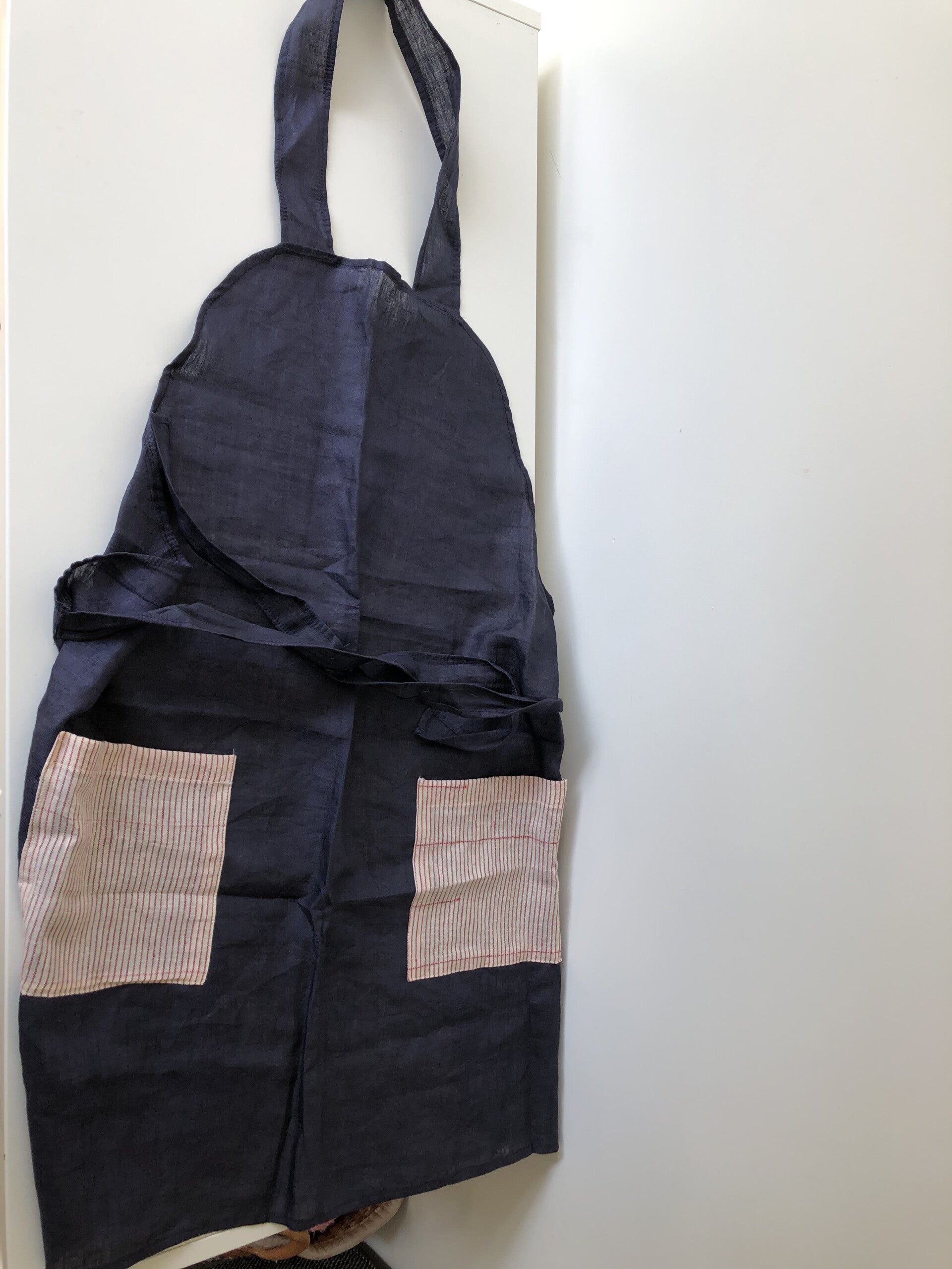 95cmx75cm apron, linen with two patchwork pockets. Suitable for garden or kitchen