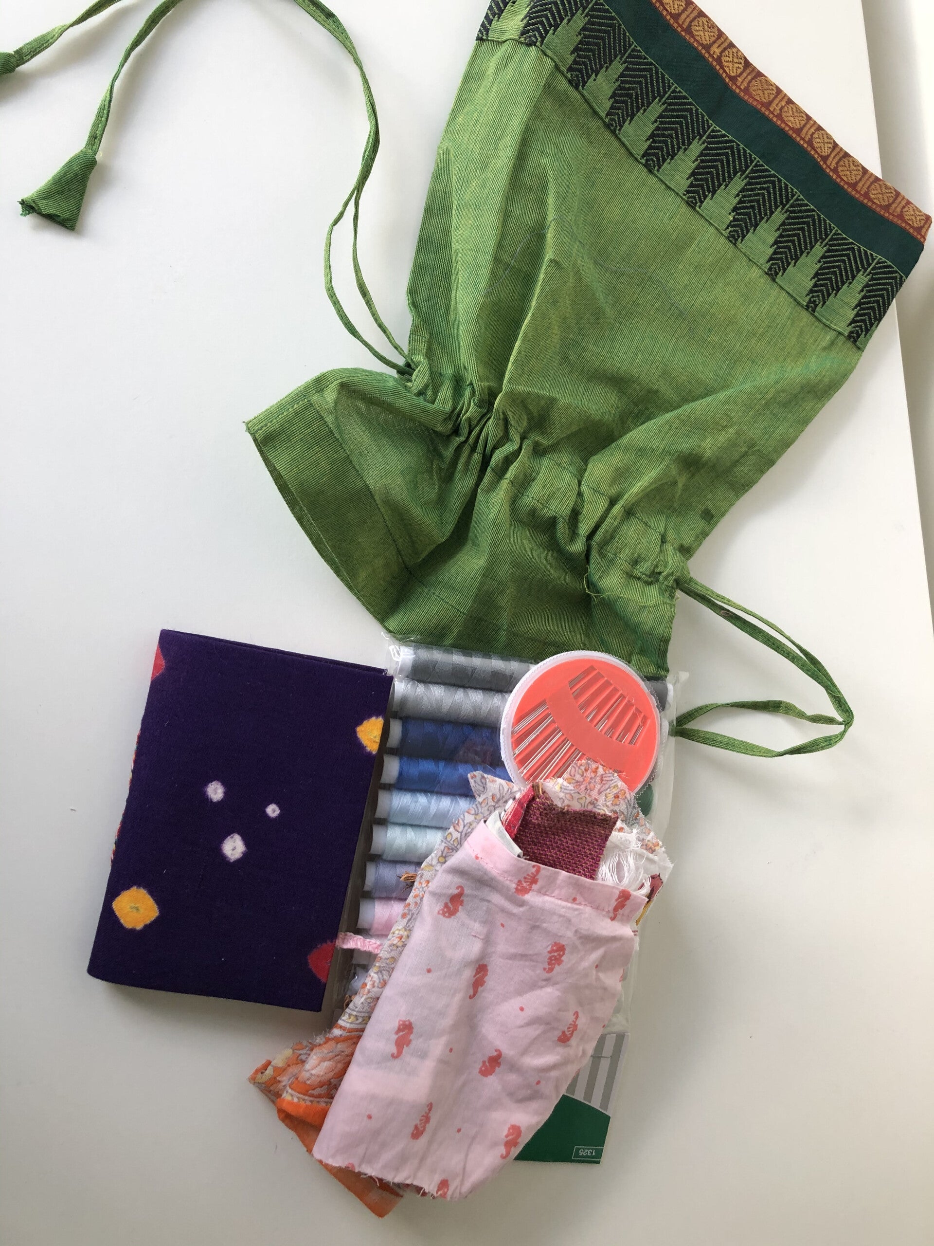 fabric scraps, needles & thread, stitch journal. The stitch journal is a pretty fabric covered notebook made from recycled paper. Kit comes in a pretty drawstring pouch