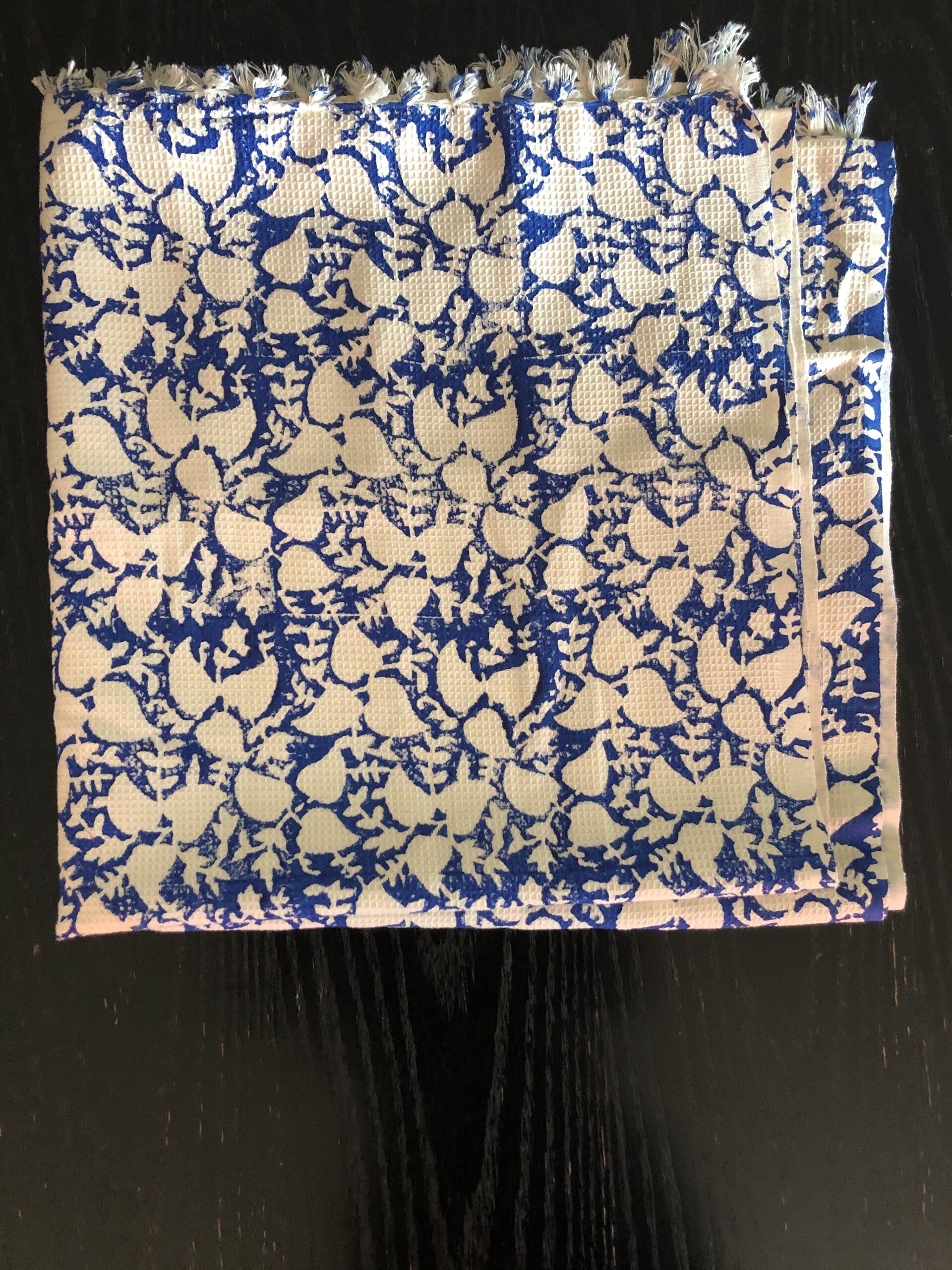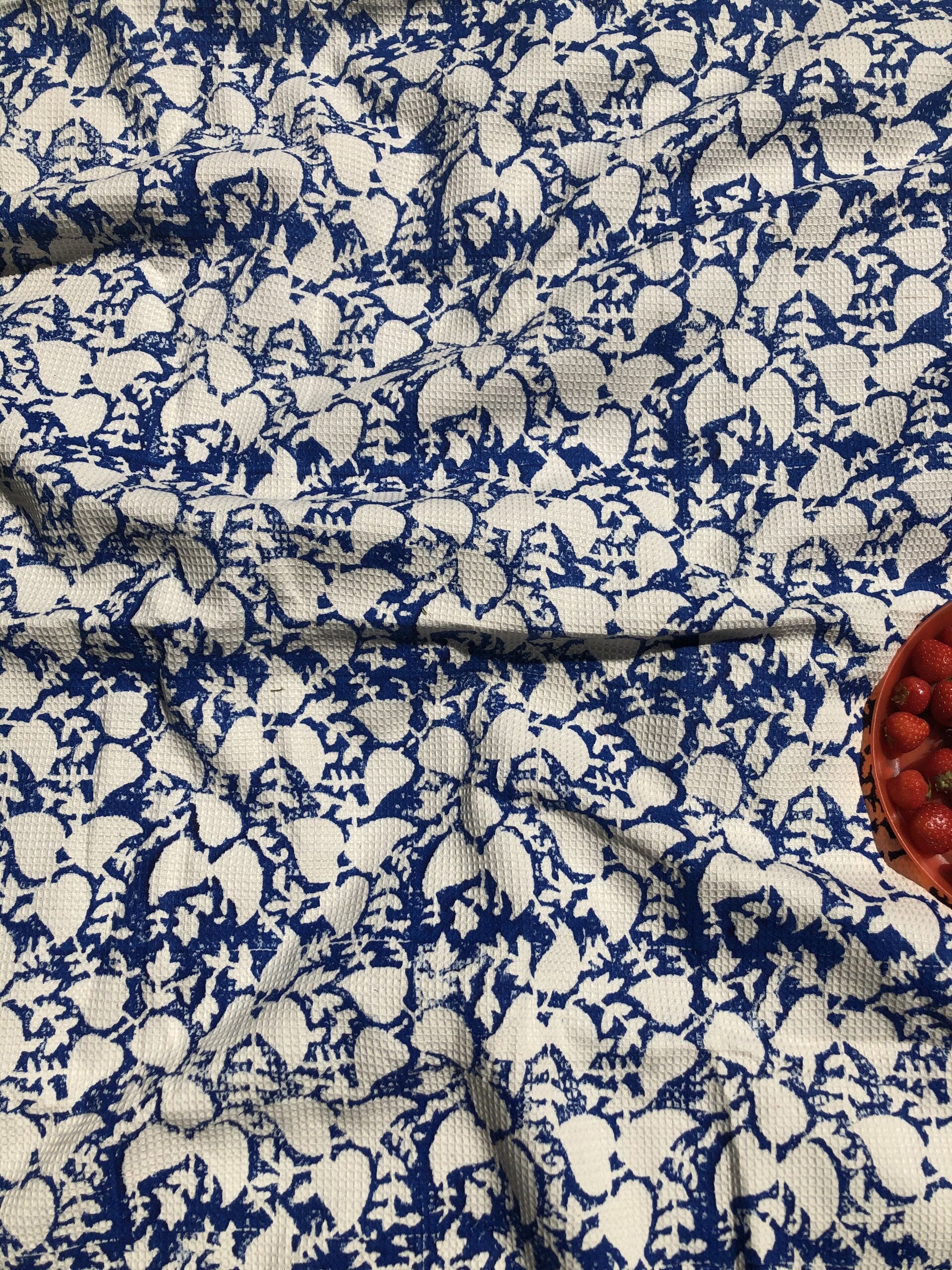 Zeer mooie picknick mat gemaakt van handgeweven katoen. de stof is handblok gedrukt in diepblauw. Het oppervlak van de handdoek is licht gebosseleerd waardoor het een interessante textuur heeft.