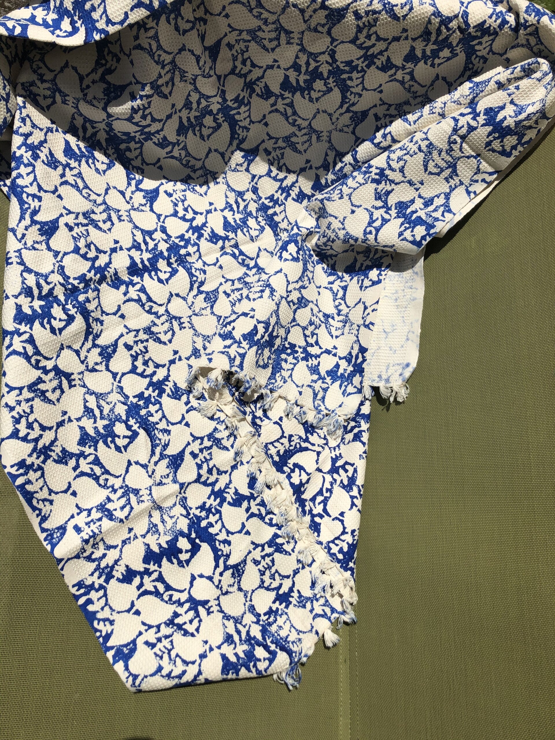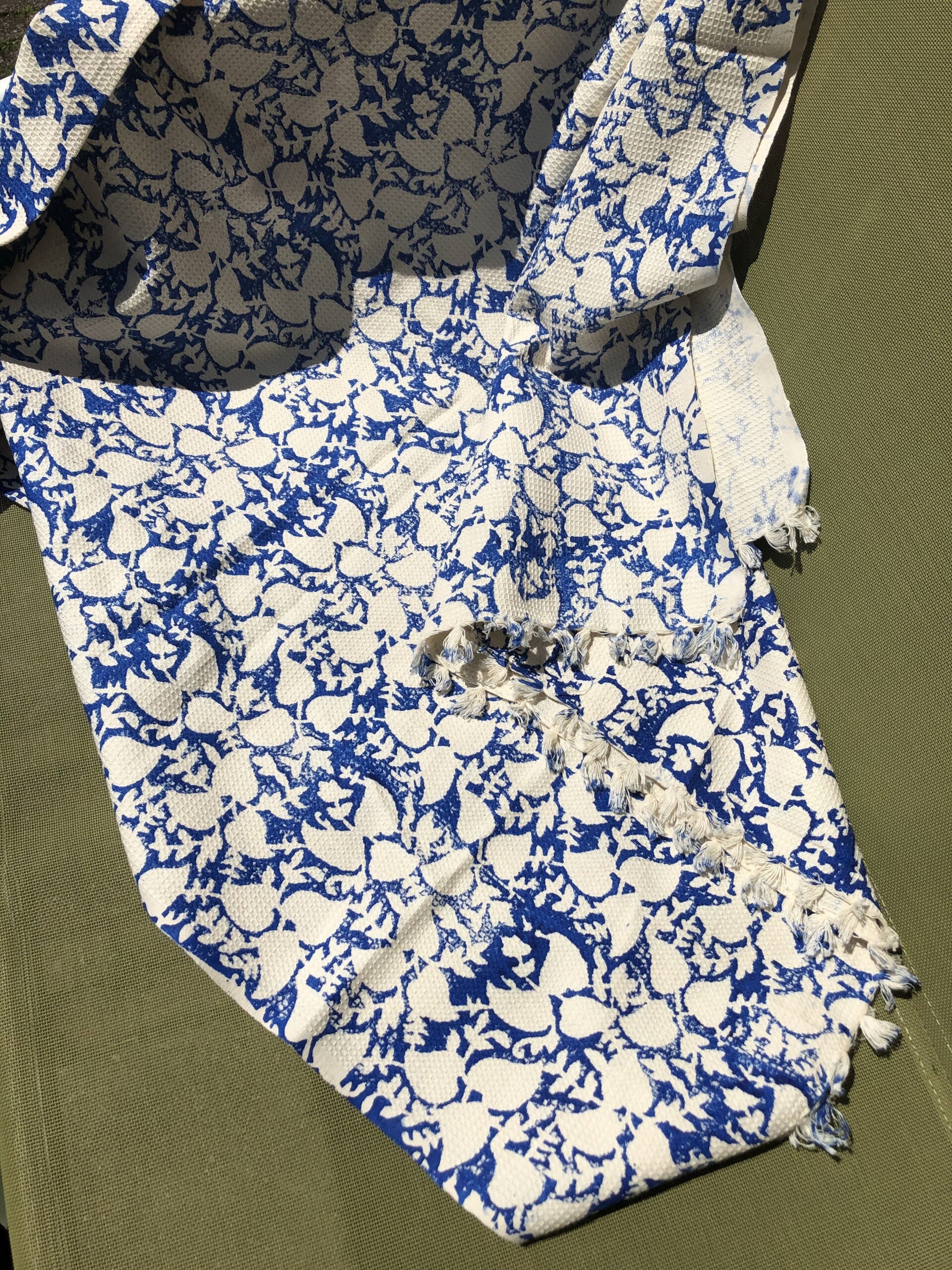 A handloom cotton background is hand block printed in a rich cobalt blue color. The fabric has a slightly embossed feel to it. Measures approximately length 174cm and width 87cm. Makes a very nice picnic or even beach mat. As it is made from cotton fabric, it is easy to fold and pack into a picnic bag.